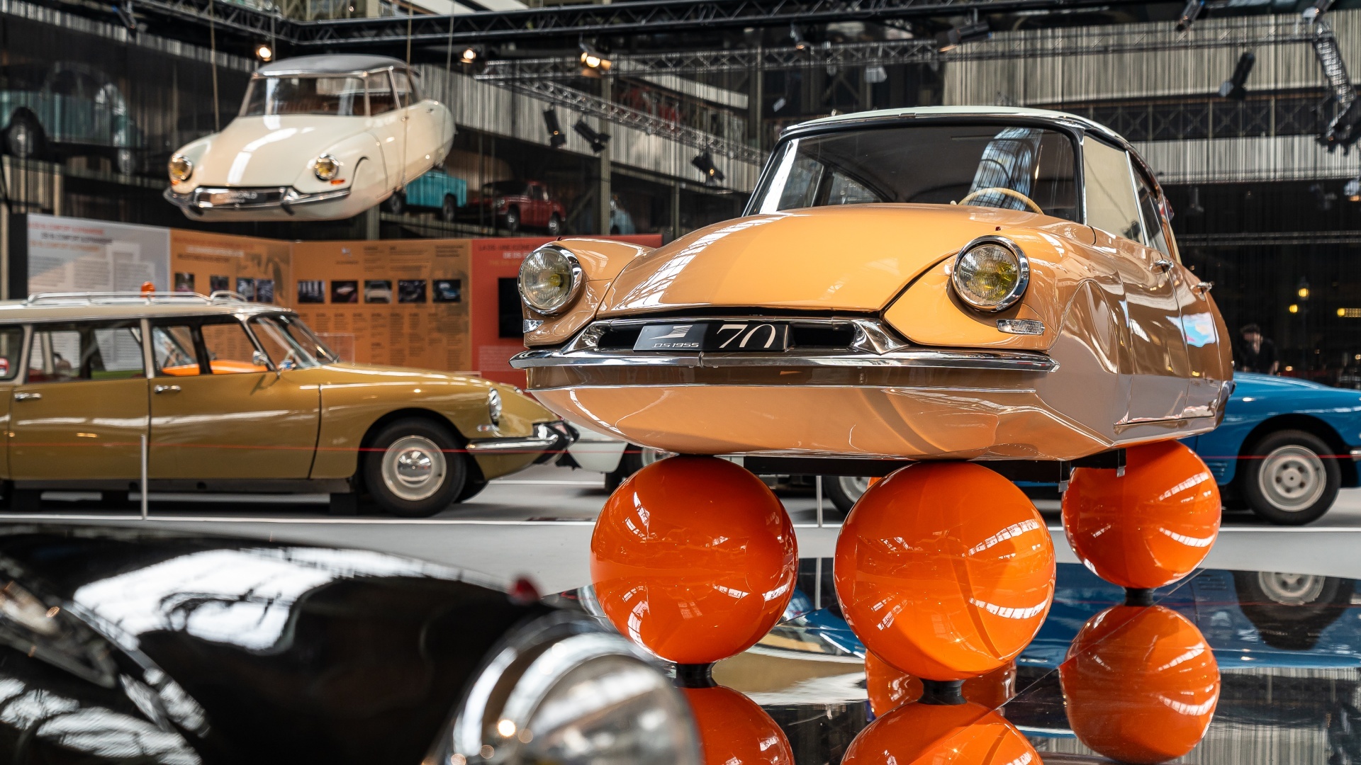 Instead of wheels, this DS 19 in its original ‘Écaille Blonde’ orange shade rests on four giant balloons—a striking visual metaphor for the car’s legendary hydropneumatic suspension. The illusion? A car that seems to float, futuristic and weightless.